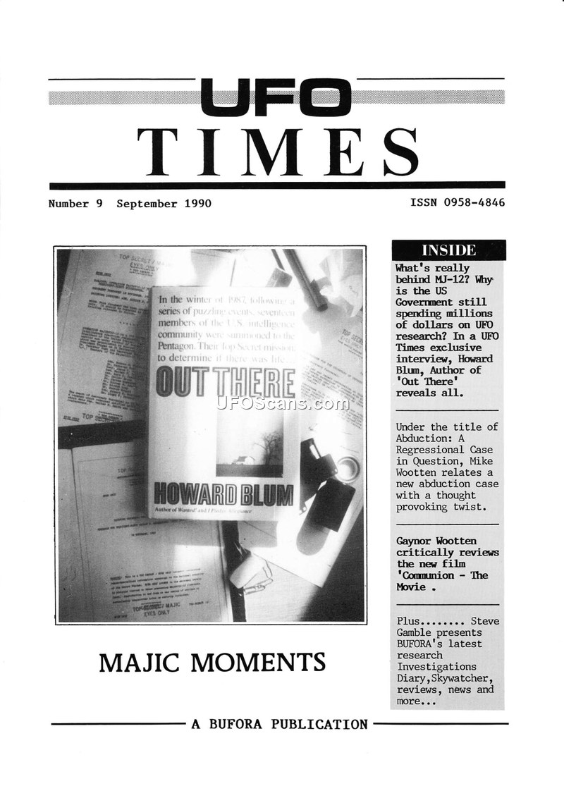 UFO Times Number 9, published in September 1990 by the British UFO Research Association (BUFORA), serves as a comprehensive digest of contemporary ufological discourse, research, and organizational updates. The issue features an exclusive interview with investigative journalist Howard Blum, author of 'Out There,' who discusses his research into the alleged MJ-12 documents and the existence of a 'UFO Working Group' within the Pentagon. Blum posits that the MJ-12 documents may be part of a government disinformation campaign designed to protect secrets related to stealth technology testing in the American Southwest, rather than evidence of extraterrestrial contact. The magazine also includes a detailed 'Research Update' by Steve Gamble, which outlines the organization's efforts to computerize their case index and conduct a joint study of UFO reports in Northamptonshire with the Northamptonshire UFO Research Centre (NUFORC). This research highlights potential 'hotspots' near Little and Great Houghton and discusses the historical context of sightings in the region. A significant portion of the issue is dedicated to the topic of abduction, with Mike Wootten presenting a 'regressional case in question' involving his own experience under hypnosis. Wootten uses this personal account to argue that abduction narratives can be complex, potentially influenced by existing cultural myths and the 'observer effect' during hypnotic sessions, rather than solely representing objective extraterrestrial encounters. The issue also contains reviews of the film 'Communion,' based on Whitley Strieber's book, and provides updates on the 'Investigations Diary,' which details recent sightings in Dublin and Cambridge. Organizational news includes a report on legal challenges faced by BUFORA and the association's ongoing efforts to establish a central headquarters. The magazine concludes with 'Skywatcher' astronomical data and 'Space News' regarding the European Remote Sensing satellite (ERS 1) and the 'Mission to Earth' project, reflecting the organization's interest in broader scientific and environmental contexts alongside their core ufological investigations.