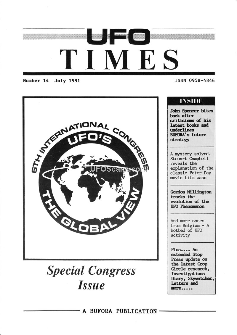 This issue of UFO Times (Number 14, July 1991) serves as a special congress issue for the British UFO Research Association (BUFORA). The publication covers a wide range of topics related to Ufology, including internal organizational updates, investigations into specific sightings, and broader discussions on the state of the field. A significant portion of the issue is dedicated to an interview with John Spencer, who discusses his new books, 'The UFO Encyclopedia' and 'UFOs The Definitive Casebook,' and his vision for the future of British Ufology, which emphasizes professionalization, business-like management, and reaching wider markets. The issue also features a detailed investigation by Steuart Campbell into the 'Peter Day movie film case' from 1973, concluding that the object filmed was burning fuel dumped by a USAF F-111 aircraft experiencing a rudder problem. Another major focus is the 'crop circle' phenomenon. Paul Fuller provides a report on the 1991 crop circle season, noting the increase in hoaxes and the involvement of meteorologists, specifically Professor Yoshi Hoki Ohtsuki of Waseda University, who has attempted to recreate crop circle-forming plasma in his laboratory. The magazine includes an 'Investigations Diary' edited by Jenny Randles, which provides updates on various ongoing cases, including the Warrington video case and the Buckinghamshire car stop. Additionally, the issue contains a section on the 'Mothman' phenomena by D.K. Rees, exploring the 1966-67 events in West Virginia and a similar British case from 1963. The 'Skywatcher' section provides astronomical data for July and August 1991, and the 'Belgian Casebook' offers testimonies from Eurofon News regarding sightings in Belgium. The publication concludes with a 'Readers Write' section, where contributors debate the merits of various theories, including the plasma vortex theory for crop circles, and discuss the handling of case reports by different research organizations. Throughout the issue, there is a recurring theme of the need for serious, scientific, and professional approaches to UFO research, moving away from what some contributors describe as 'amateur' or 'cult-like' tendencies.