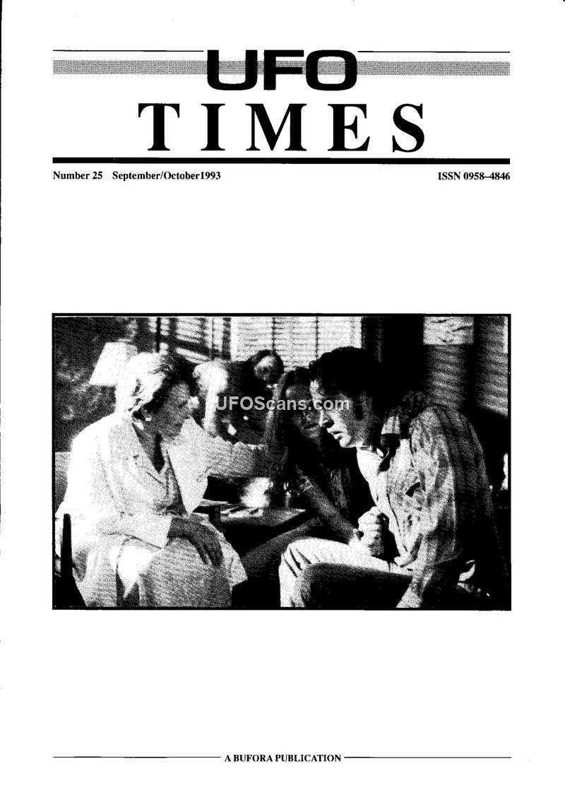 This document is the September/October 1993 issue (Number 25) of 'UFO Times', the official publication of the British UFO Research Association (BUFORA). The magazine serves as a central hub for the association's activities, including administrative updates, membership information, and reports on UFO investigations. A significant portion of this issue is dedicated to a detailed, multi-part account of the 'Lightning Foxtrot 94' incident, involving an American pilot named William Schafer who disappeared while intercepting an unidentified object over the North Sea in 1970. The account includes transcripts of communications between the pilot and the Staxton Wold radar station, detailing the pilot's visual contact with a conical object and a glass-like sphere. The magazine also features articles on 'UFO Realities' by Gordon Millington, which discusses the physical nature of UFOs and radiation effects, and a report on a sighting in Belgium involving M. and Mme. Vleugels. Additionally, the issue contains 'Investigations Diary' by Jenny Randles, which provides updates on BUFORA's ongoing projects, such as the Abduction Experiment and the compilation of a BUFORA case book. The magazine also includes a 'Readers Write' section where members debate the association's role in providing witness support and counseling, with contributors like Hilary Evans arguing that BUFORA should focus on physical UFO research rather than the psychic or psychological aspects of witness experiences. The issue concludes with book reviews, sky observation data, and advertisements for UFO-related merchandise and services.