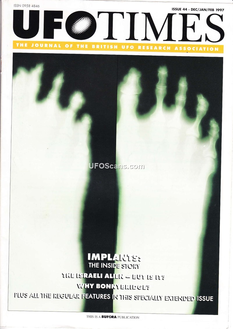 This document is Issue 44 of 'UFO Times', the journal of the British UFO Research Association (BUFORA), published in early 1997. The journal serves as a compilation of news, investigative reports, and opinion pieces regarding UAP and related phenomena. Key content includes reports on UFO sightings in various global locations, such as South Africa, South Korea, and the Hebrides. A significant portion of the journal is dedicated to the investigation of an alleged 'dead alien' in Israel, which BUFORA analyzed through mass spectrometry, ultimately concluding that the samples were of terrestrial origin. The journal also features articles on the recovery of alleged alien implants by Derrol Sims, the return of Scottish ufologist Malcolm Robinson to active research, and a tribute to Nigel Stephenson, a founding figure of the British UFO research community. Additionally, the issue contains editorial commentary on the 'Earthlight' theory, discussions on the 'abduction phenomenon' and the use of regressive hypnosis, and reports on the 'Southport Triangle' sighting. The journal also provides administrative information for BUFORA members, including details on upcoming conferences and the 'BOLREC' project, which aims to catalog 'Ball of Light' phenomena. The publication reflects the association's commitment to scientific, unbiased research while navigating the complexities of witness testimony, media coverage, and the broader ufological community.