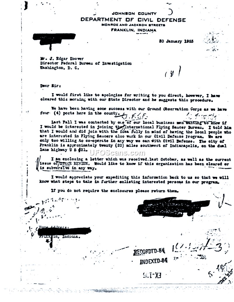 This document consists of a letter dated January 20, 1953, from the Johnson County Department of Civil Defense in Franklin, Indiana, to FBI Director J. Edgar Hoover. The author of the letter, a local Civil Defense official, inquires whether the 'International Flying Saucer Bureau' (IFSB) is a subversive organization. The author explains that they were contacted by a local businessman about joining the IFSB and had considered integrating local interest in flying saucers into the Civil Defense program. The letter includes enclosures, specifically a letter received the previous October and an issue of 'SPACE REVIEW,' and requests that the FBI provide information on the IFSB's status so the department can determine how to proceed with enlisting interested persons. The document also contains several pages of the 'SPACE REVIEW' publication, which includes articles about flying saucer sightings, theories, and a directory of representatives, including Edgar L. Plunkett in England.