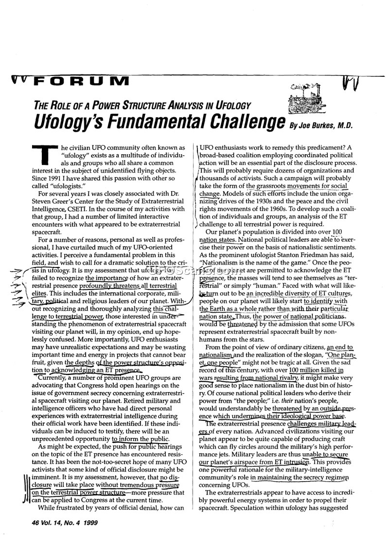 In this article, Dr. Joe Burkes presents a critical analysis of the Ufology community, arguing that it has largely failed to address the fundamental political and structural challenges posed by the extraterrestrial presence. Burkes contends that the primary obstacle to disclosure is not merely a lack of evidence, but the active opposition of global power structures, including national governments, military-intelligence agencies, and multinational corporations. He asserts that these entities perceive the ET presence as a threat to their authority, economic monopolies—specifically in the energy sector—and established religious belief systems. Burkes highlights that the current global order, built upon nationalism and the competition for resources like oil, would be fundamentally destabilized by the acknowledgment of advanced, non-human civilizations. He suggests that the military-intelligence community maintains a secrecy regime to protect its own power base and that the media is used to trivialize the subject. The author advocates for a shift in strategy within the UFO community, moving away from passive observation toward a coordinated, grassroots political campaign. He emphasizes that disclosure will not occur through a simple 'landing on the White House lawn,' but rather through sustained pressure on Congress and the political establishment. Burkes also touches upon the role of contactees and the potential for human-initiated contact, suggesting that while the path to disclosure is difficult, it is necessary for the future of humanity. He concludes by calling for a peaceful, unified approach to challenge the existing power structures and facilitate a transparent dialogue regarding the ET presence.