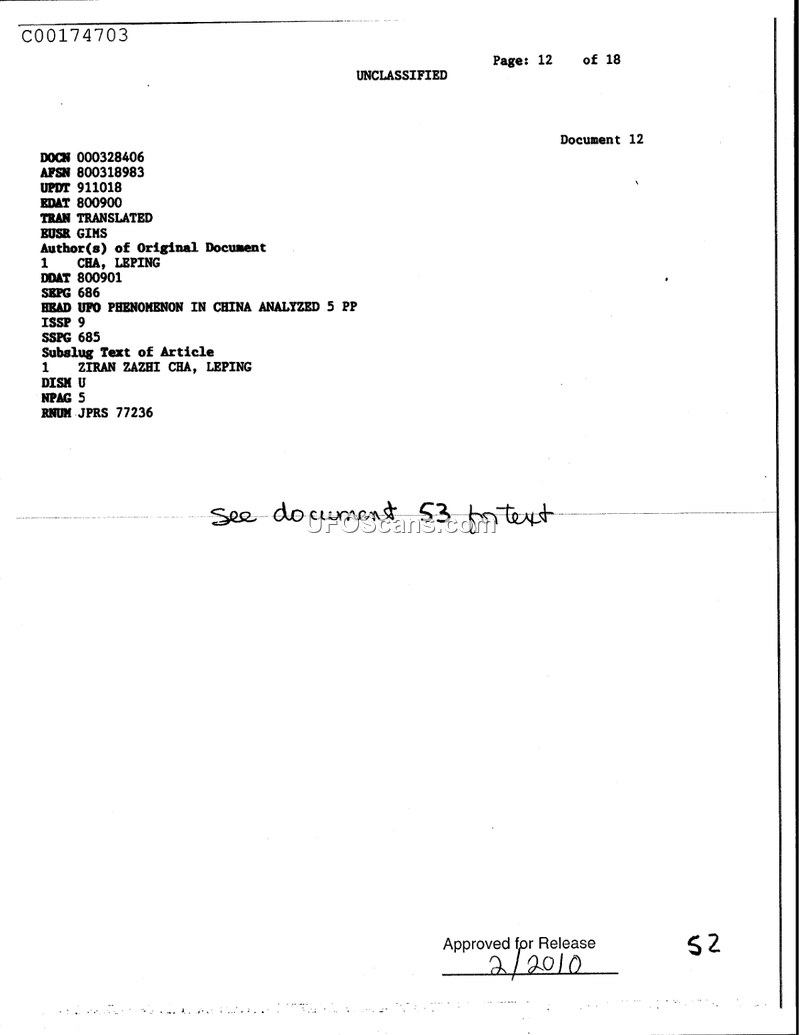 This document serves as a reference page, identified as Document 12 within a larger collection. It provides bibliographic metadata for an article titled 'UFO PHENOMENON IN CHINA ANALYZED,' authored by Cha Leping. The document notes that the original article consists of five pages and is associated with JPRS report number 77236. The document itself is marked as unclassified and was approved for release in February 2010. A handwritten note on the page directs the reader to 'Document 53' for the actual text of the article.
