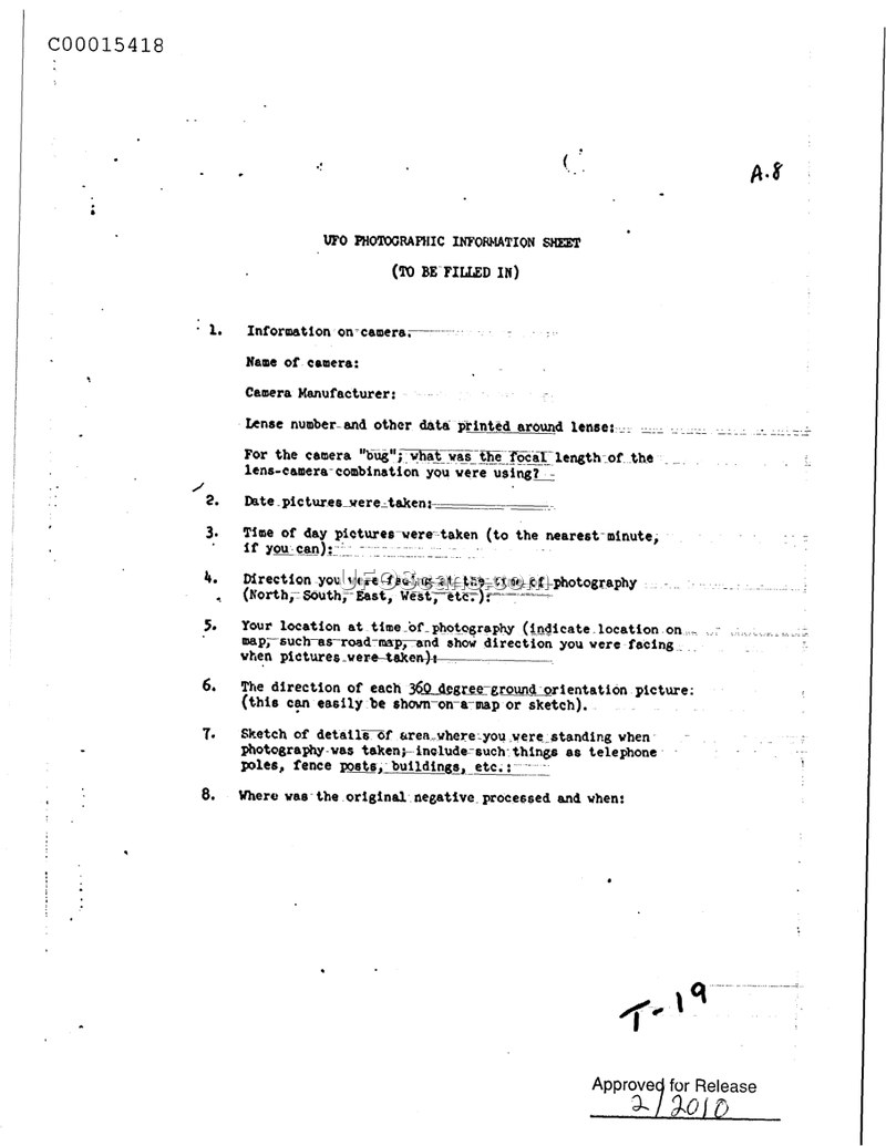 This document is a standardized form titled 'UFO Photographic Information Sheet.' It serves as a template for collecting technical and situational data regarding photographs taken of Unidentified Aerial Phenomena. The form requests eight specific categories of information: camera details (name, manufacturer, lens data, and focal length), the date and time of the photographs, the direction the photographer was facing, the photographer's location relative to a map, the direction of 360-degree ground orientation pictures, a sketch of the surrounding area (including landmarks like telephone poles or buildings), and information regarding the processing of the original negative. The document bears the reference number C00015418 and a notation 'T-19' at the bottom. It was approved for release in February 2010.