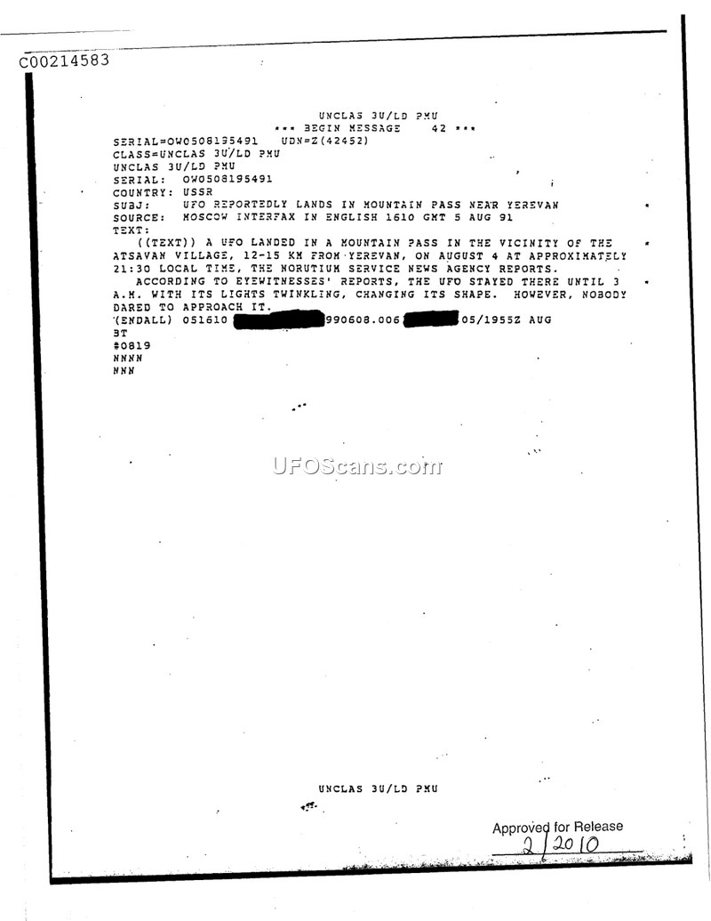 This document is a declassified message reporting a UFO sighting in the Soviet Union. According to reports from the Moscow Interfax and the Norutium Service News Agency, an unidentified aerial object landed in a mountain pass near the village of Atsavan, located 12 to 15 kilometers from Yerevan. The incident reportedly began at approximately 21:30 local time on August 4, 1991. Eyewitnesses observed the object, which was described as having twinkling lights and the ability to change its shape. The object remained at the location until 3:00 A.M. the following morning. The report notes that no individuals dared to approach the object during this time.
