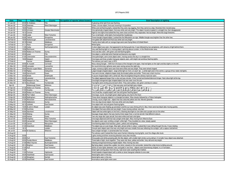 A comprehensive log of UFO sightings reported across the United Kingdom in 2002. The document records dates, locations, and brief descriptions of various aerial phenomena observed by the public.