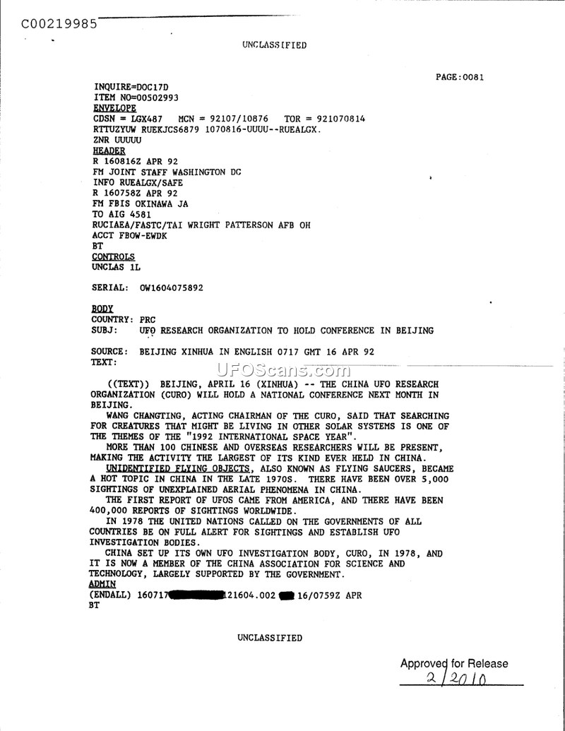 This intelligence cable, dated April 16, 1992, reports on an upcoming national conference to be held in Beijing by the China UFO Research Organization (CURO). According to Wang Changting, the acting chairman of the organization, the conference will focus on the search for extraterrestrial life, aligning with the themes of the 1992 International Space Year. The document highlights that the event is expected to draw over 100 researchers from both China and abroad, making it the largest of its kind held in the country. The text provides historical context, noting that interest in unidentified flying objects, or flying saucers, became a significant topic in China during the late 1970s, with over 5,000 reported sightings in the country and 400,000 worldwide. The document further states that the United Nations called for government-level UFO investigation bodies in 1978, leading to the establishment of CURO in China. CURO is described as a member of the China Association for Science and Technology and receives support from the Chinese government.