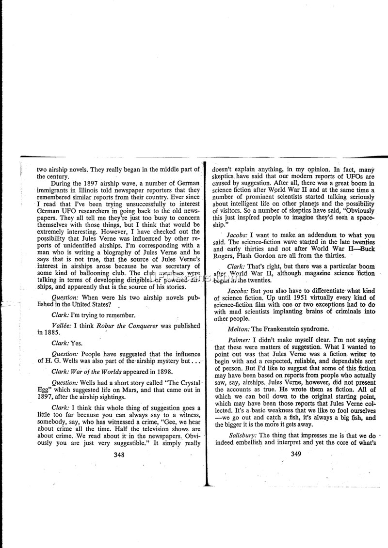 This document contains the proceedings of the First International UFO Congress held in Chicago in 1977. The text is a transcript of various panel discussions and presentations involving prominent researchers in the field, including Allen Hynek, Jacques Vallée, Stanton Friedman, and Dr. R. Leo Sprinkle. The discussions cover a wide range of topics, starting with the historical context of airship sightings in the late 19th century and the influence of science fiction authors like Jules Verne and H. G. Wells. A significant portion of the text is dedicated to the relationship between UFO phenomena and parapsychology. Participants discuss 'contactee' experiences, including reports of prophetic dreams, healing compulsions, and telepathic communication. Ben Jamison, a professor of mathematics, shares his observations on the psychological aspects of these encounters. The document also features personal accounts, such as Ken Arnold's 1952 sighting near Susanville, California, where he observed two objects he described as 'big fat aluminum cylinders' flying in echelon formation. Arnold details his attempts to document these objects and the subsequent difficulties in getting his findings taken seriously by military authorities. Stanton Friedman discusses the challenges of government secrecy, noting that many former servicemen possess significant information but are bound by security oaths. He highlights the difficulty of declassifying information that is sensitive by nature, even if it is technically old. The participants express frustration with the lack of openness regarding UFO data and the tendency for the scientific community to dismiss reports as 'crackpot' theories. Throughout the proceedings, there is a recurring theme of the need for a more rigorous, yet open-minded, approach to studying UFOs, acknowledging that the phenomenon may involve both physical 'nuts-and-bolts' reality and complex psychological or parapsychological components. The document concludes with reflections on the future of UFO research and the importance of collecting reliable testimony from witnesses.