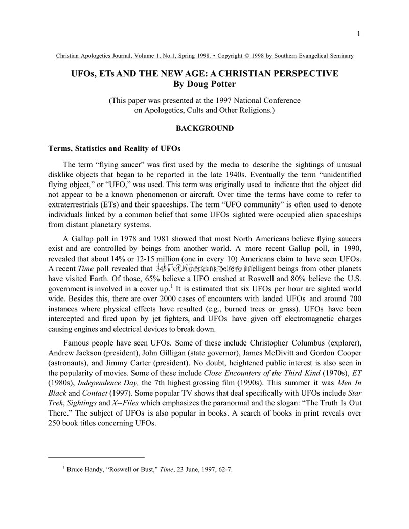 This paper, authored by Doug Potter and presented at the 1997 National Conference on Apologetics, Cults and Other Religions, examines the UFO phenomenon from a Christian perspective. The author traces the history of UFO sightings from ancient times to the modern era, noting the rise of the UFO movement following the 1947 sightings by Ken Arnold and the Roswell incident. Potter discusses various government investigations, including Project Sign, Project Grudge, and Project Blue Book, noting that while some sightings remain unexplained, many are attributed to natural phenomena, hoaxes, or military activities. The paper argues that the UFO movement has increasingly become intertwined with New Age occultism, with some enthusiasts claiming that aliens are here to announce a 'coming new age' or a 'second coming' of a common teacher. Potter critiques these beliefs, asserting that they are incompatible with Christian teachings regarding the nature of God, the divinity of Jesus Christ, and the prohibition of occult practices. The author further suggests that some UFO reports, particularly those involving abductions or contact, share characteristics with demonic possession and psychic phenomena. He cites various researchers, including Hugh Ross and Bill Alnor, to support the argument that there is no scientific or scriptural evidence for extraterrestrial life and that the pursuit of UFO research can be spiritually and physically dangerous. The paper concludes by dismissing the idea of extraterrestrial visitation as statistically improbable and spiritually misguided, urging Christians to focus on their faith rather than the search for alien life.