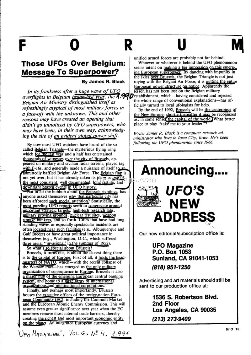 This article, published in UFO Magazine in 1991, discusses the wave of UFO sightings in Belgium that began in 1990. The author, James R. Black, describes the phenomenon as a 'Belgian Triangle'—a mysterious flying wing observed by thousands of witnesses. The article highlights the Belgian Air Ministry's atypical response to these events, noting that they sought assistance from local ufologists. Black argues that these sightings are not random, suggesting that UFO reports frequently congregate around strategic targets such as high-tech research labs, military proving grounds, and nuclear test sites. He emphasizes the geopolitical significance of Brussels, noting its role as the headquarters of NATO and the European Community, and suggests that the UFO phenomenon may be making a deliberate impression on the emerging European power structure. The article concludes by speculating that by the end of 1992, Brussels would become the centerpiece of the new Europe.