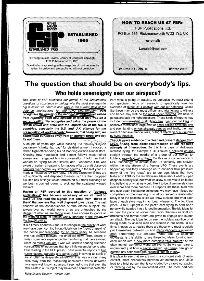 This document is a 2006 issue of Flying Saucer Review containing various reports on UFO sightings, military encounters, and space-based anomalies. It argues that UFOs pose a significant security risk and criticizes the high level of government secrecy surrounding the phenomenon.