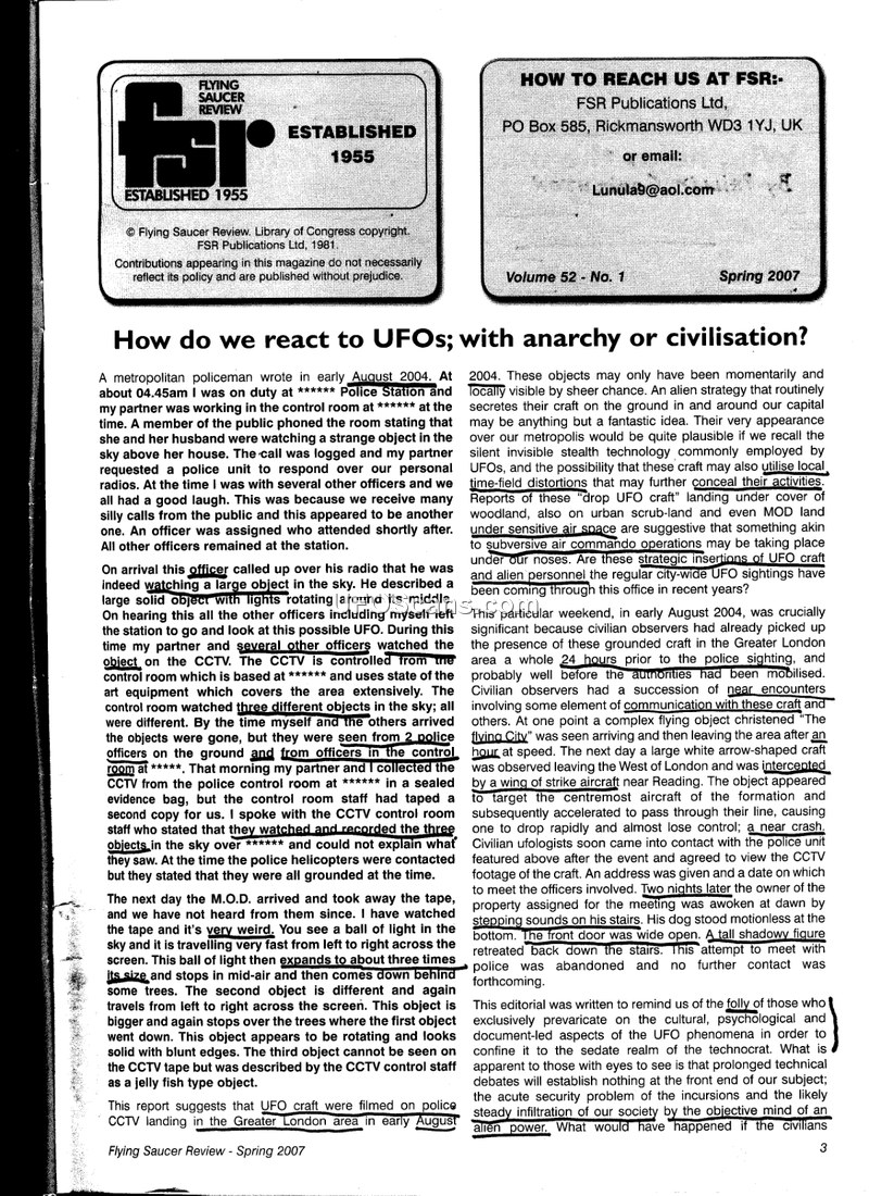 This document, published in the Spring 2007 issue of Flying Saucer Review, presents an account of a UFO sighting reported by a metropolitan policeman in early August 2004. The witness claims that at approximately 04.45am, he and a partner observed a large object with lights rotating around its middle in the sky. According to the report, the object was monitored via police CCTV. The witness states that he and his partner later collected the CCTV tape, which allegedly showed three distinct objects. The report further claims that the Ministry of Defence (M.O.D.) arrived to take possession of the tape. The author describes subsequent observations of objects in the sky, including an arrow-shaped craft that was allegedly intercepted by strike aircraft. The narrative suggests that these events were suppressed and that the witness's attempt to follow up with authorities was met with silence. The article concludes by criticizing the lack of transparency regarding such phenomena and suggests that the public is being kept in the dark about potential incursions.