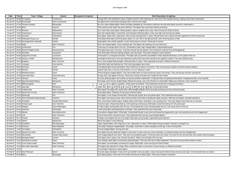 This document is a chronological log of hundreds of UFO/UAP sightings reported across the United Kingdom in 1997. It provides a detailed record of the dates, locations, and physical descriptions of the observed phenomena.