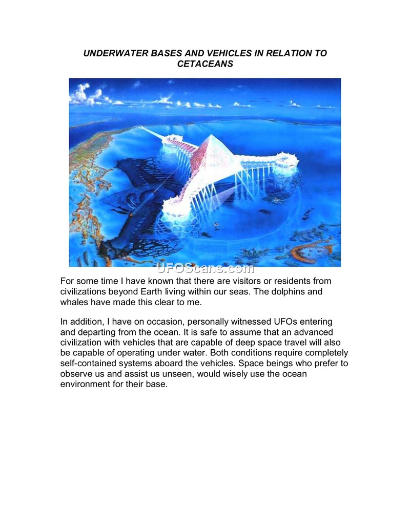 This document presents a narrative arguing that extraterrestrial civilizations maintain underwater bases on Earth. The author claims that dolphins and whales have communicated this information to them. The text asserts that advanced civilizations capable of deep space travel are also capable of underwater operation, and that these beings use the ocean to observe and assist humanity while remaining unseen. The author describes personal sightings of UFOs entering and departing from the ocean and references the work of artist Kinsley Jarrett, who depicted spacecraft with pools for cetaceans. The document further claims that the Earth is hollow, with inner-Earth civilizations accessible through openings at the North and South Poles, a concept the author links to the journals of Rear Admiral Richard E. Byrd. Scientific claims are made regarding the volume of water beneath the Earth's crust, citing a 2002 press release from the Tokyo Institute of Technology. Historical UFO sightings are cataloged, including an 1845 report from the Malta Times and an 1870 report from the English corvette Lady of the Lake. The author also discusses the 1967 contact case involving the planet Iarga and the 1951 sighting by Commander Graham Bethune. A witness testimony from Dan Willis regarding a 2001 Disclosure Project presentation is included. Finally, the author recounts a personal experience in Kona, Hawaii, involving a lenticular cloud, swirling energy, and unusual dolphin behavior, which they interpret as an interaction with an underwater ET vehicle.