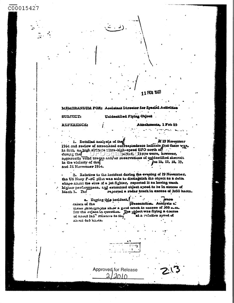 This document consists of two separate memoranda regarding Unidentified Flying Objects. The first memorandum, dated 11 February 1965, is addressed to the Assistant Director for Special Activities from the Office of Scientific Intelligence (OSI). It analyzes reports of high-altitude, high-speed UFO sightings occurring in the USSR between 16 and 24 November 1964. Specifically, it details an incident on 19 November 1964, where a US Navy F-8C pilot observed a delta-wing object with performance capabilities exceeding that of the F-8C, including speeds in excess of Mach 2. Radar data from the incident indicated a track exceeding 3500 knots. The OSI concludes that the object was likely a delta-wing fighter with superior climb performance. The memorandum further notes that missile test firings were scheduled during this period, suggesting the area was a potential target for reconnaissance, and mentions the possibility of MiG-21 activity, though no definitive evidence was available at the time. The second memorandum, dated 1 October 1958, is from Herbert Scoville, Jr., Assistant Director of Scientific Intelligence, to the Director of the Photographic Intelligence Center. It addresses a request regarding the photography of UFOs. Scoville notes that while his office has reviewed the matter, the primary responsibility for UFO investigations lies with the Air Force. He provides suggestions on how to proceed with the research of a Mr. Fine, who possessed photographs of interest, recommending that the recipient seek advice from the AD/O regarding the appropriate approach to Mr. Fine's experiments.