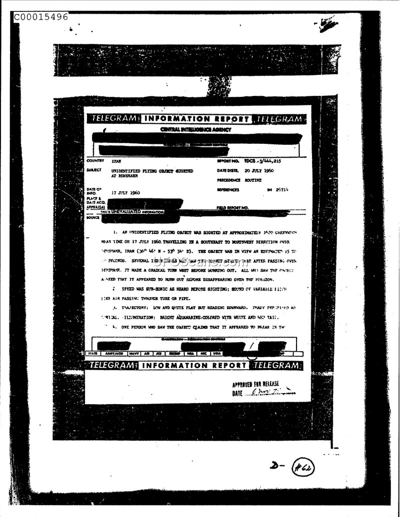 A CIA report documenting a 1960 sighting of a conical, aquamarine-colored aerial object over Benshahr, Iran. The object exhibited sub-sonic flight and a distinct sound before burning out.