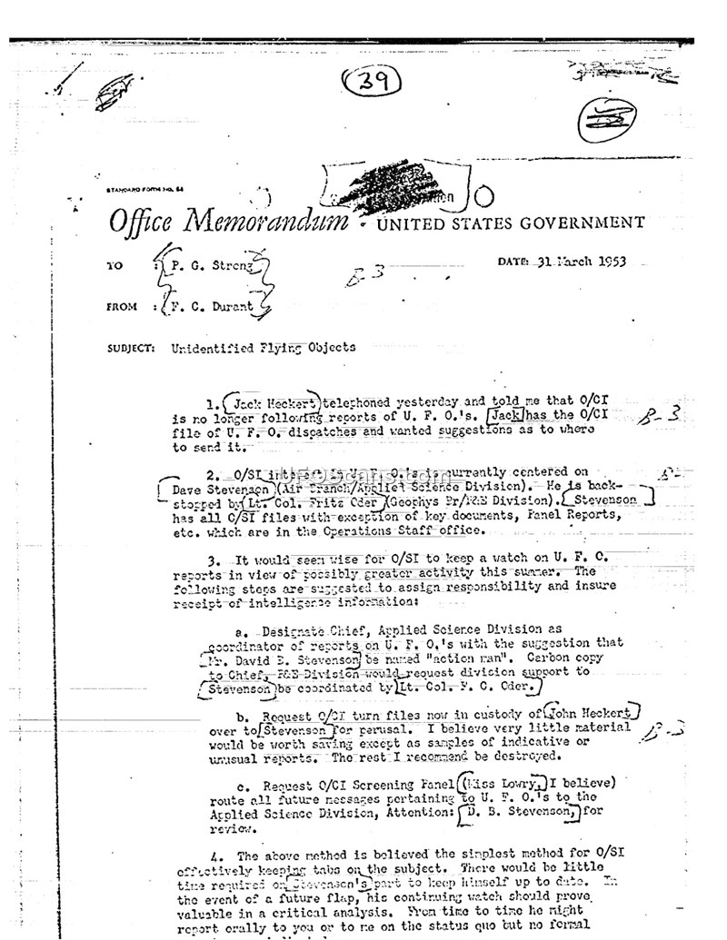 This memorandum, dated March 31, 1953, from F. C. Durant to P. G. Strong, outlines a proposed administrative shift regarding the handling of Unidentified Flying Object (U.F.O.) reports within the organization. Durant notes that Jack Heckert of O/CI had informed him that O/CI was ceasing its tracking of U.F.O. reports and requested guidance on where to send existing files. Durant reports that O/SI interest is currently focused on Dave Stevenson of the Air Branch/Applied Science Division, who is supported by Lt. Col. Fritz Oder. Anticipating increased U.F.O. activity during the summer, Durant proposes a formal procedure to maintain oversight. He suggests designating the Chief of the Applied Science Division as the coordinator for U.F.O. reports, with Dave Stevenson acting as the primary 'action man.' Furthermore, Durant recommends that existing files held by Jack Heckert be transferred to Stevenson for review, with the suggestion that most material be destroyed, retaining only samples of indicative or unusual reports. Finally, he proposes that the O/CI Screening Panel, specifically Miss Lowry, be instructed to route all future U.F.O.-related messages directly to the Applied Science Division for Stevenson's attention. Durant concludes by stating that if this plan is approved, he will prepare the necessary directive memoranda.