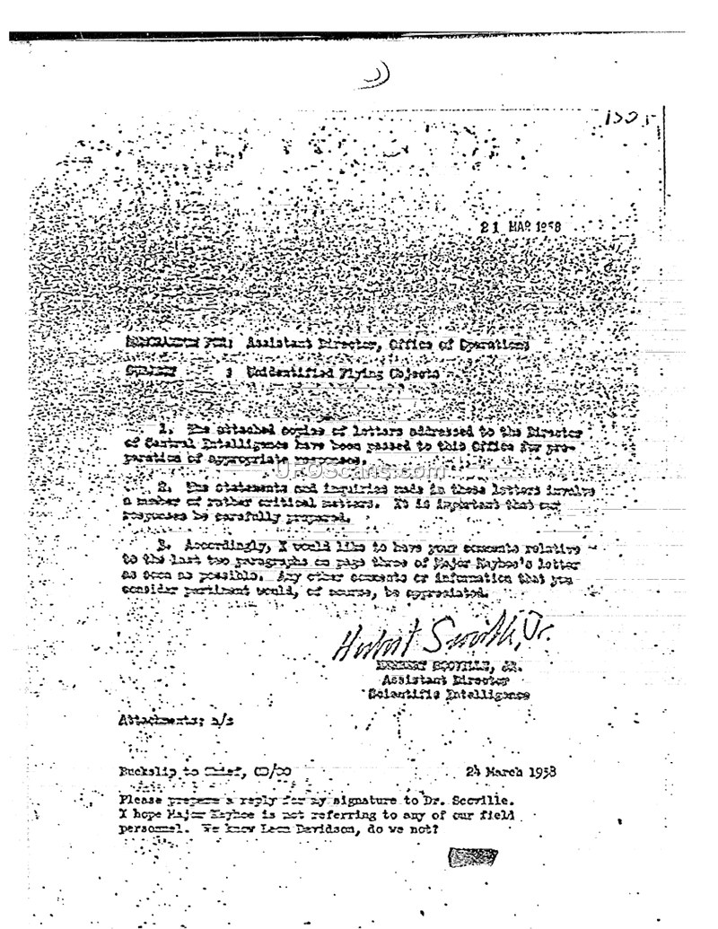 A 1958 memorandum from the Assistant Director of Scientific Intelligence requests the Office of Operations to draft responses to letters from Major Keyhoe regarding UFOs. A follow-up note expresses concern about potential references to field personnel and mentions Leon Davidson.