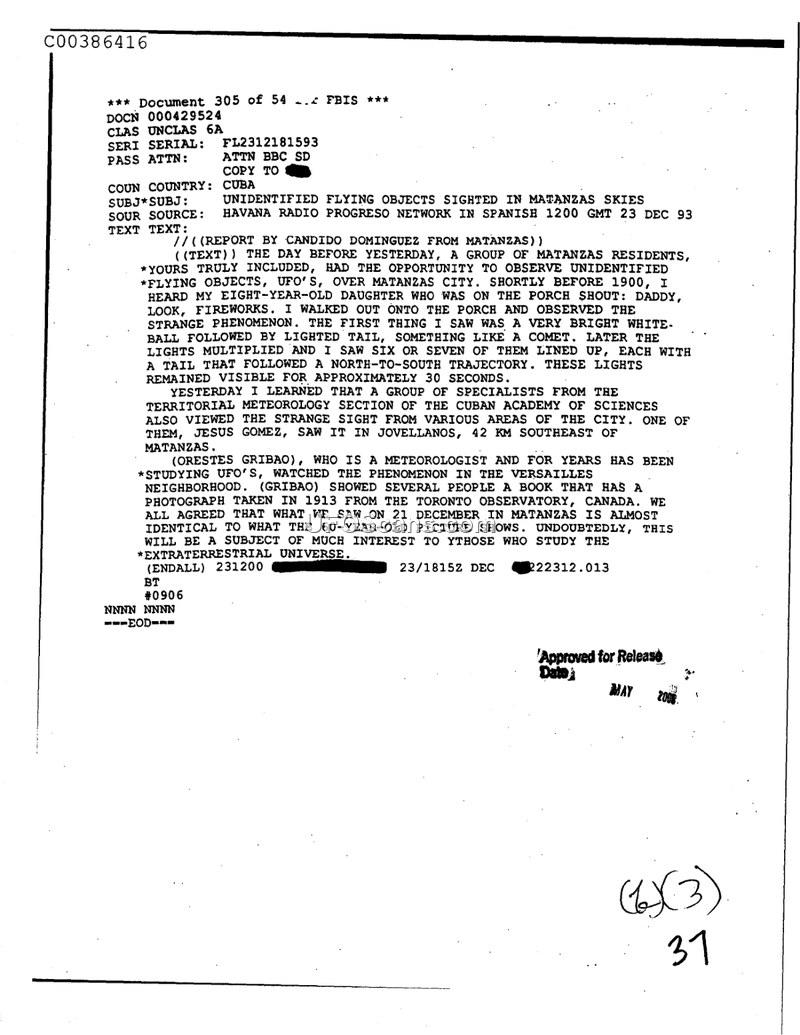 This document is an FBIS report dated December 23, 1993, detailing a sighting of unidentified flying objects in Matanzas, Cuba, on December 21, 1993. The report originates from a broadcast by the Havana Radio Progreso network. According to the account provided by Candido Dominguez, a group of residents in Matanzas observed a phenomenon shortly before 1900 hours. The witness described seeing a bright white ball followed by a lighted tail, which subsequently multiplied into six or seven objects. These objects were observed moving in a north-to-south trajectory and remained visible for approximately 30 seconds. The report notes that specialists from the Territorial Meteorology Section of the Cuban Academy of Sciences also observed the phenomenon from various locations in the city. One individual, Jesus Gomez, reported seeing the objects from Jovellanos, located 42 kilometers southeast of Matanzas. Orestes Gribao, a meteorologist who has studied UFOs for years, reportedly compared the sighting to a photograph taken in 1913 at the Toronto Observatory in Canada, suggesting a similarity between the two events.