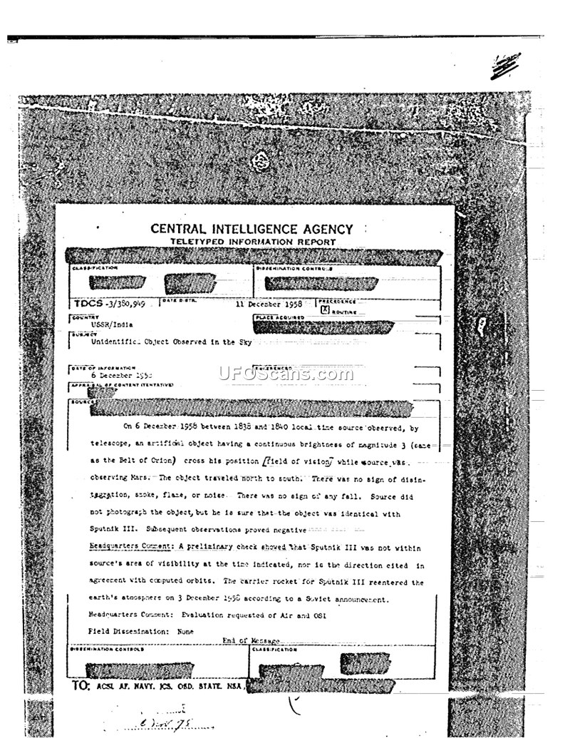 A 1958 CIA report documents a sighting of an unidentified object initially thought to be Sputnik III. Headquarters analysis determined the object could not have been Sputnik III, as that craft had already reentered the atmosphere.