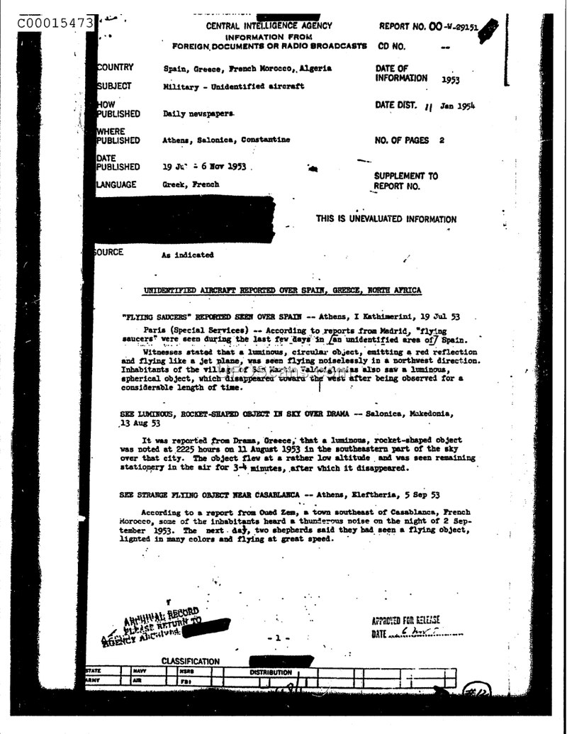 This Central Intelligence Agency report, dated January 11, 1954, serves as a compilation of press reports concerning unidentified aircraft sightings across Spain, Greece, French Morocco, and Algeria during the latter half of 1953. The document highlights three specific instances. The first report, sourced from the Athenian newspaper Kathimerini on July 19, 1953, details sightings in Spain, where witnesses described a luminous, circular object emitting a red reflection and flying like a jet plane without noise. Inhabitants of San Martin Valdeiglesias specifically reported a spherical object that disappeared toward the west. The second incident, reported from Drama, Greece, on August 13, 1953, describes a luminous, rocket-shaped object observed at 2225 hours on August 11, 1953. This object was seen at a low altitude in the southeastern sky, remaining stationary for three to four minutes before disappearing. The final report, from the Athenian newspaper Eleftheria on September 5, 1953, concerns an event near Oued Zem, French Morocco. Residents reported a thunderous noise on the night of September 2, 1953, and two shepherds subsequently claimed to have seen a flying object that was multi-colored and traveling at high speed. The document is marked as un-evaluated information.