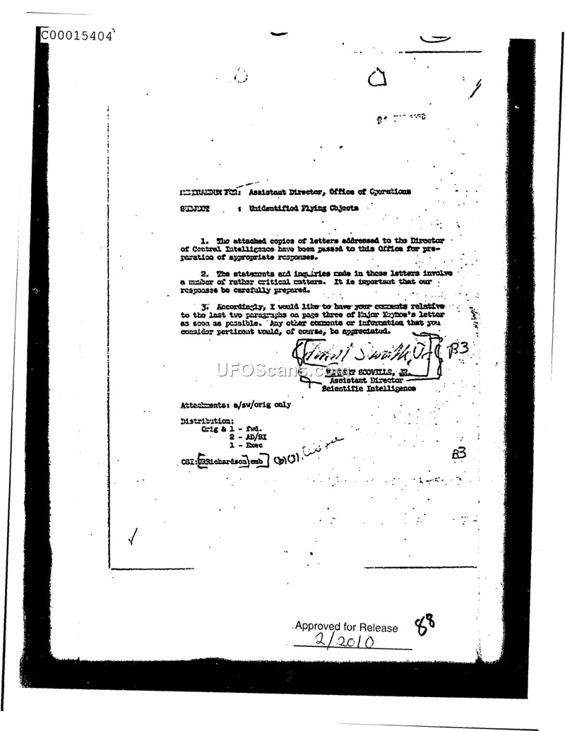 This memorandum, issued by Herbert Scovills, Jr., the Assistant Director of Scientific Intelligence, is addressed to the Assistant Director of the Office of Operations. The document concerns the subject of Unidentified Flying Objects. It notes that copies of letters previously addressed to the Director of Central Intelligence have been forwarded to the Office of Operations for the preparation of appropriate responses. The author highlights that these letters contain inquiries regarding critical matters. Furthermore, the memorandum explicitly requests comments from the Office of Operations concerning the final two paragraphs found on page three of a letter authored by Major Rynoe. The document concludes with a request for any other pertinent information that the recipient might provide.