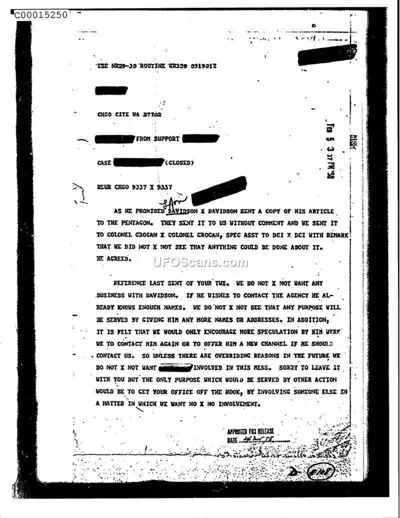 This document is an internal communication regarding an article authored by an individual named Davidson. Davidson had previously promised to send a copy of his article to the Pentagon, which he subsequently did. The Pentagon forwarded this material to the Agency without comment. The Agency then passed the article to Colonel Grocan, Special Assistant to the DCI, with the remark that they did not see that anything could be done about the content of the article, a sentiment with which the Colonel agreed. The document explicitly states that the Agency does not wish to have any further business with Davidson. It is noted that if Davidson wishes to contact the Agency, he already possesses sufficient names to do so. The Agency expresses a desire to avoid providing him with any additional names or addresses, fearing that further interaction would only encourage more speculation on his part. Furthermore, the Agency wishes to avoid offering him a new channel of communication. The document concludes by stating that the Agency does not want a specific, redacted entity involved in this matter, and expresses regret for leaving the recipient with this issue, noting that the only purpose served by further action would be to relieve the recipient's office of the burden by involving someone else in a matter the Agency wishes to avoid entirely.