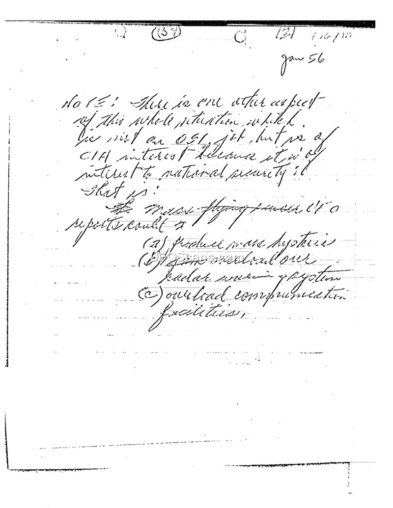 A 1956 CIA note identifying national security risks associated with mass flying saucer reports. The primary concerns listed are mass hysteria, radar interference, and communication overload.