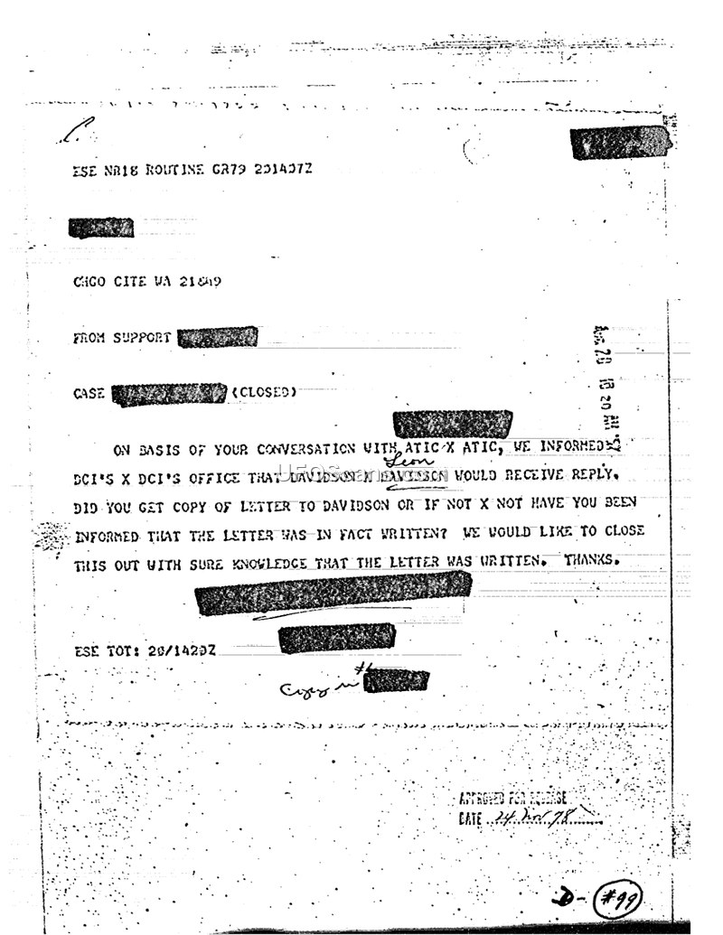 This document is a routine communication, identified by reference number ESE NR18 ROUTINE GR79 201407Z, originating from a SUPPORT entity. The primary purpose of the message is to verify the status of correspondence intended for an individual named Davidson. The text references a prior conversation involving ATIC and an individual named Leon. The author notes that the DCI's office had been informed that Davidson would receive a reply. The document explicitly asks the recipient if they have received a copy of the letter addressed to Davidson, or if they were informed that the letter was written. The stated objective of this inquiry is to close the matter with certainty regarding the dispatch of the letter. The document includes a stamp indicating it was approved for release on October 24, 1978.