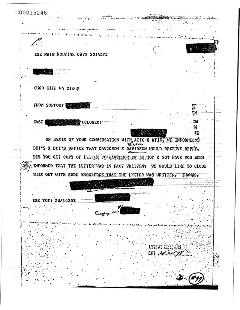 This is an internal administrative memo inquiring about the status of a letter sent to an individual named Davidson. It confirms that the DCI's office was notified of the intent to reply to Davidson.