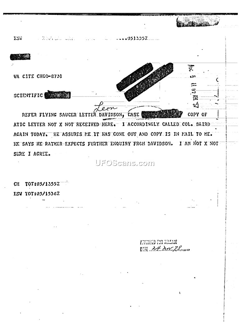 This document is a brief internal memorandum concerning the status of a 'flying saucer' letter authored by an individual named Davidson. The author of the memo notes that a copy of an ATIC letter had not been received. To resolve this, the author contacted Col. Baird, who assured them that the document had been sent and was currently in the mail. The author concludes the memo by expressing doubt regarding Col. Baird's assurance, stating, 'I AM NOT X NOT SURE I AGREE.' The document includes reference number CHCO-8731 and was approved for release on November 24, 1978.