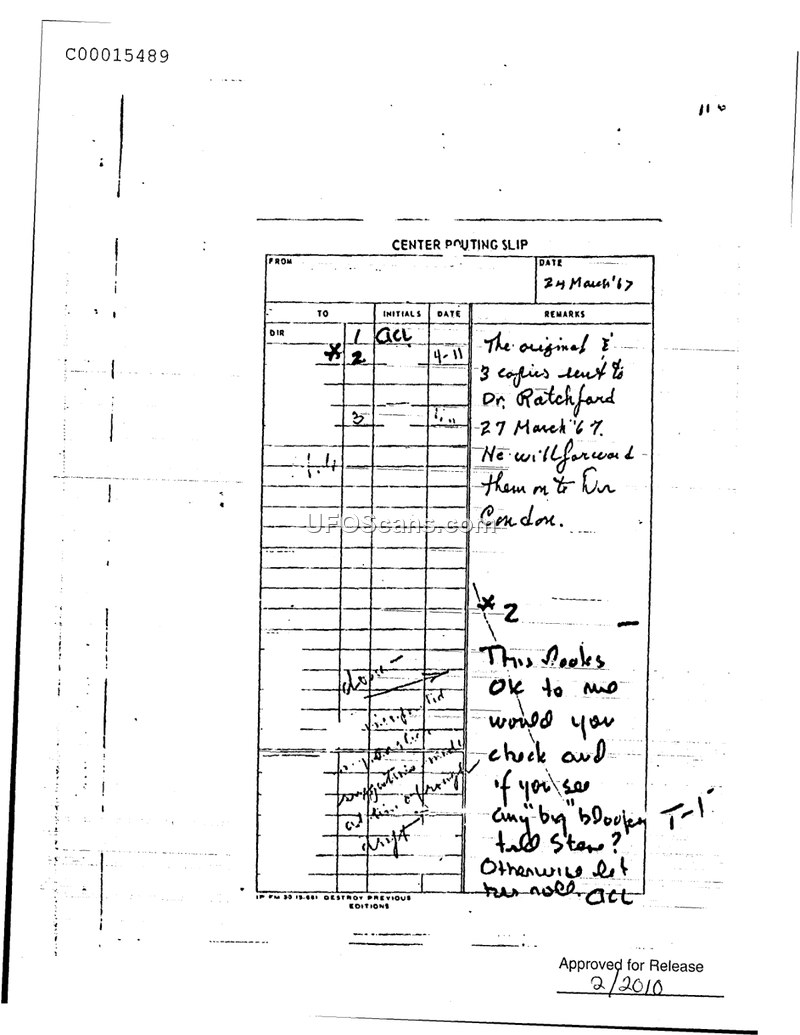 This document is a Center Routing Slip dated 24 March 1967. It serves as a record of administrative handling for a set of documents. The routing slip indicates that the original and three copies of a document were sent to a Dr. Ratchford on 27 March 1967, with the instruction that he would subsequently forward them to Dr. Condon. Additionally, the document contains a handwritten note addressed to an individual named Stew, asking him to review the material for any "big bloopers" and to approve it if it is acceptable.