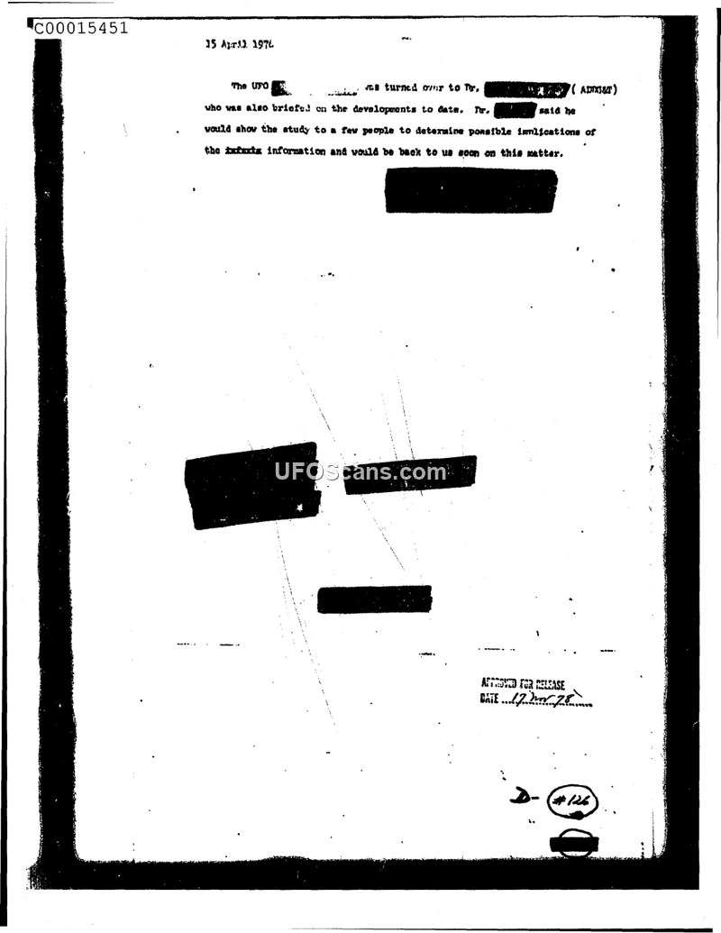 A memorandum from 15 April 1976 documents the transfer of a UFO study to a doctor for further review and assessment of its implications. The document is heavily redacted.