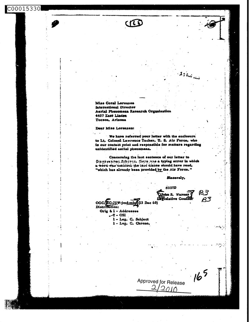 This document is a formal letter dated December 13, 1960, from the Office of General Counsel (OGC) to Miss Coral Lorenzen, the International Director of the Aerial Phenomena Research Organization (APRO) in Tucson, Arizona. The primary purpose of the correspondence is to inform Miss Lorenzen that her previous letter and its enclosure have been forwarded to Lt. Colonel Lawrence Tacker of the U.S. Air Force, who is identified as the designated contact point for matters concerning unidentified aerial phenomena. Additionally, the author, John S. Warner, Legislative Counsel, writes to correct a typographical error in a previous letter sent to Congressman Scherer. Warner clarifies that a word was omitted in the final sentence of that letter and provides the corrected phrasing: 'which has already been provided by the Air Force.' The document includes a distribution list indicating copies were sent to the addressee, the Office of Special Investigations (OSI), and the Legislative Counsel's subject and chronological files.