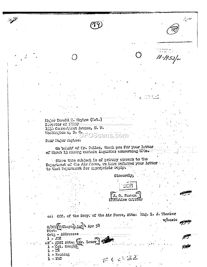 This document is a formal letter dated April 4, 1958, written by an Executive Officer (J. S. [illegible]) on behalf of Mr. Dulles. The letter is addressed to Major Donald E. Keyhoe (Ret.), who was serving as the Director of NICAP at 1935 Connecticut Avenue, N.W., Washington, D.C. The correspondence serves as a response to a letter previously sent by Major Keyhoe on March 13, in which he had made certain inquiries regarding UFOs. The author informs Major Keyhoe that because the subject matter of his inquiry is of primary concern to the Department of the Air Force, his letter has been referred to that department for an appropriate reply. The document includes a carbon copy distribution list, which notes that a copy was sent to the Office of the Secretary of the Air Force, specifically to the attention of Major L. J. Thacker. Other internal distribution includes copies for JSE, ADSI (Attn: Mr. Lexow), Col. Grogan, and others.