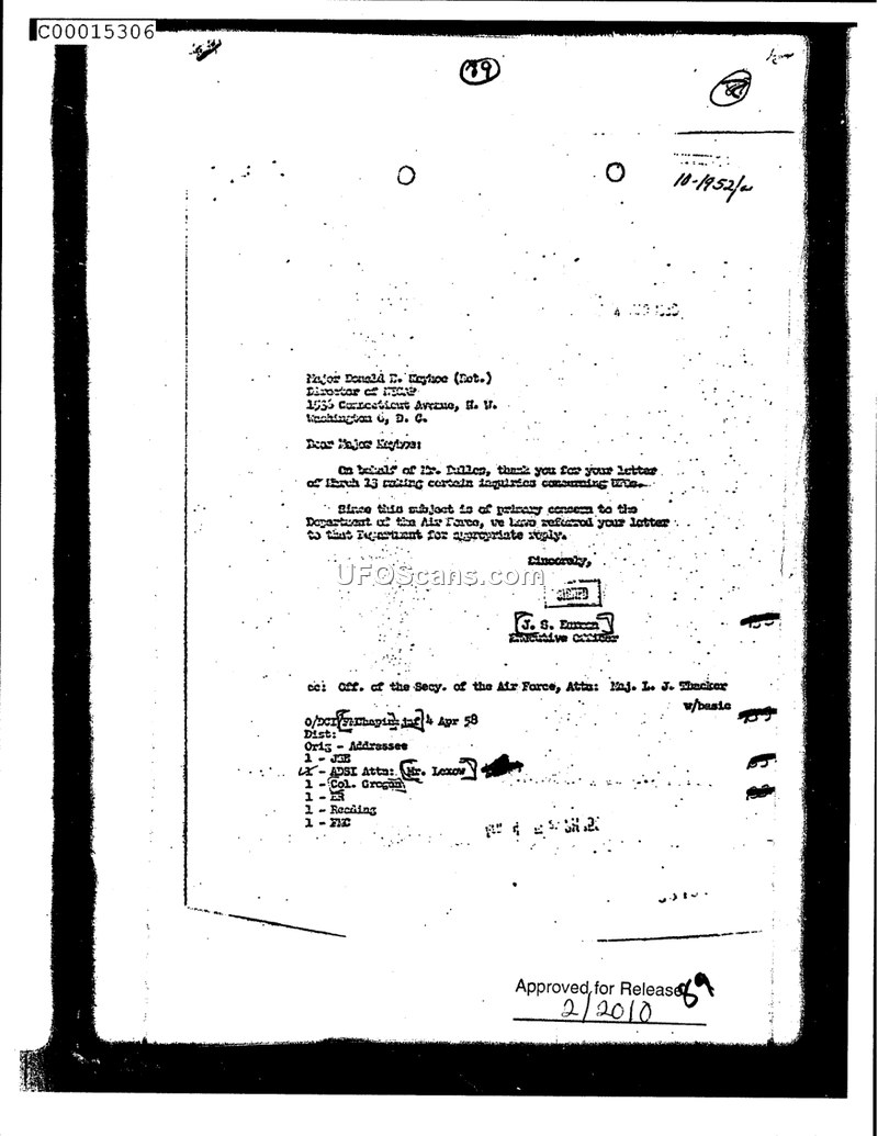 The CIA acknowledged an inquiry from NICAP Director Donald E. Keyhoe regarding aerial phenomena. The agency referred the matter to the Department of the Air Force, citing their primary jurisdiction over the subject.