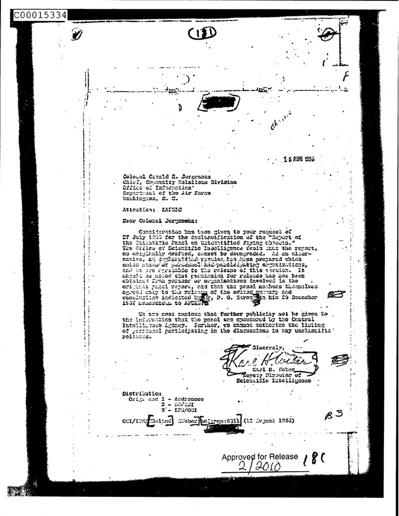 Correspondence regarding the declassification of the Report of the Scientific Panel on Unidentified Flying Objects