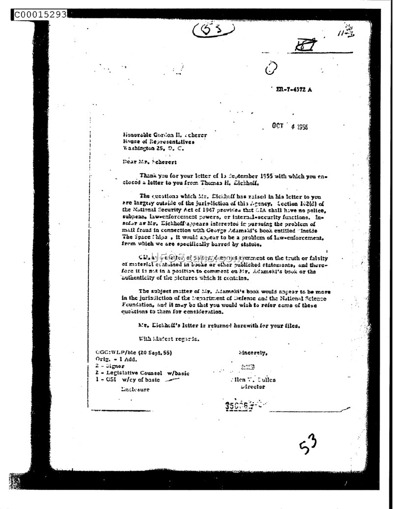This document is a formal letter dated October 4, 1955, from Allen W. Dulles, Director of the Central Intelligence Agency, to the Honorable Gordon H. Scherer of the House of Representatives. The correspondence serves as a response to a letter Representative Scherer had forwarded to the CIA, which had been written by a constituent named Thomas H. Eickhoff. In his letter, Mr. Eickhoff had raised concerns that the CIA addressed as being largely outside of its jurisdiction. Specifically, the agency clarifies that under the National Security Act of 1947, it possesses no police, subpoena, or law enforcement powers, nor does it have internal security functions that would allow it to investigate potential mail fraud related to George Adamski's book, 'Inside The Space Ships.' Furthermore, Dulles explains that it is the policy of the CIA not to comment on the veracity of published materials or the authenticity of images contained within such books. The letter concludes by suggesting that the subject matter of Mr. Adamski's book would be more appropriately addressed by the Department of Defense or the National Science Foundation. The original letter from Mr. Eickhoff was returned to Representative Scherer for his files.