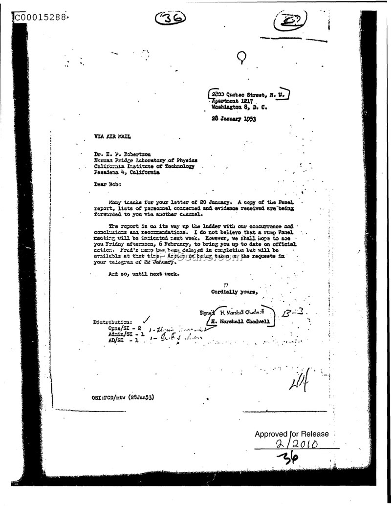 Correspondence between H. Marshall Chadwell and Dr. H. P. Robertson regarding Panel report