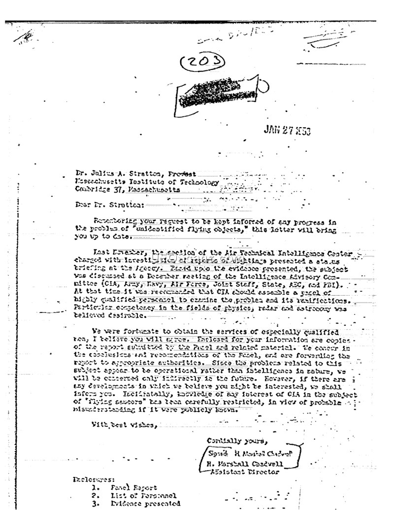 This document consists of correspondence and internal memoranda from the Central Intelligence Agency (CIA) dated January 27, 1953, regarding the findings of the Advisory Group on Unidentified Flying Objects. The correspondence is addressed to Dr. Julius A. Stratton of the Massachusetts Institute of Technology, informing him of the progress made by the agency in investigating reports of unidentified flying objects. The document details the formation of a panel of experts, chaired by Dr. H. P. Robertson, to examine the evidence and implications of these sightings. The panel included experts in physics, radar, and astronomy. The primary conclusion reached by the Advisory Group was that unidentified flying objects did not pose a threat to the national security of the United States. However, the group expressed concern regarding the potential for public hysteria and the overloading of military communication facilities due to the volume of reports. The document includes a 'Charge to O/SI Advisory Group' which outlines the scope of the investigation, including the review of available evidence, the assessment of national security risks, and the evaluation of current CIA and Air Technical Intelligence Center (ATIC) methodologies. The document also lists possible explanations for sightings, categorized into psychological factors, misidentification of conventional objects (such as aircraft, balloons, or birds), natural phenomena, unconventional man-made devices, and extraterrestrial origins. Additionally, the document contains a series of sketches illustrating various reported flight formations of unidentified objects. The internal memorandum notes that the CIA intended to restrict knowledge of its interest in the subject to avoid public misunderstanding. The files related to this subject were to be retained by the Weapons Division of the CIA.