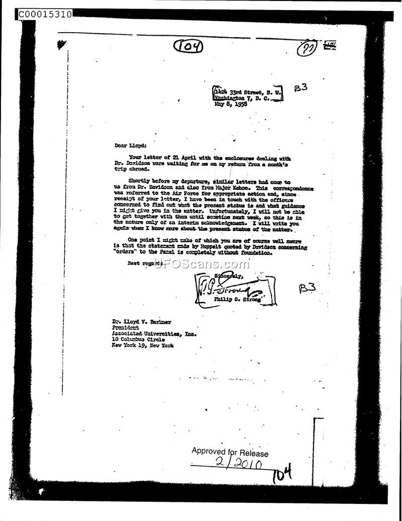 A 1958 letter from Philip G. Strong to Dr. Lloyd V. Berkner regarding inquiries about Dr. Davidson and the Air Force. The author clarifies that a specific claim regarding 'orders' to the Panel is unfounded.