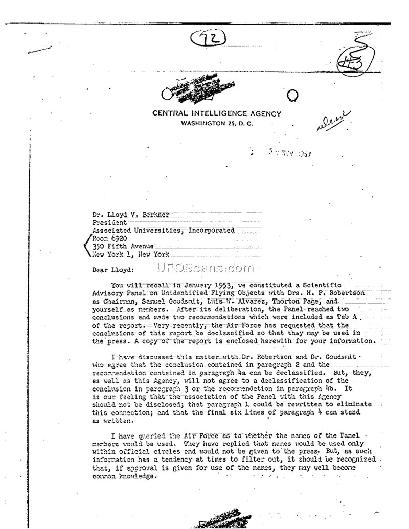 This correspondence, dated November 1957, is from the Central Intelligence Agency to Dr. Lloyd V. Berkner regarding the declassification of a report produced by the Scientific Advisory Panel on Unidentified Flying Objects. The Panel, which included Dr. H. P. Robertson as Chairman, Samuel Goudsmit, Luis W. Alvarez, Thornton Page, and Dr. Berkner, was constituted in January 1953. The Air Force had recently requested that the conclusions and recommendations of the Panel's report (referred to as Tab A) be declassified for public release in the press. The author, Philip G. Strong, Deputy Assistant Director of the CIA, notes that he consulted with Dr. Robertson and Dr. Goudsmit regarding this request. They agreed that the conclusions in paragraph 2 and the recommendation in paragraph 4a could be declassified. However, they opposed the declassification of the conclusion in paragraph 3 and the recommendation in paragraph 4b. Furthermore, the CIA expressed a strong desire to conceal the Agency's association with the Panel. Strong proposed that paragraph 1 of the report be rewritten to eliminate any mention of the CIA's connection, while allowing the final six lines of paragraph 4 to remain as written. The letter also addresses concerns regarding the potential disclosure of the names of the Panel members. While the Air Force indicated that these names would only be used within official circles and not provided to the press, the CIA expressed skepticism, noting that such information often filters out and could eventually become common knowledge. The document concludes with a request for Dr. Berkner's reaction to the proposed declassification strategy and his opinion on whether to withhold the Agency's connection to the Panel.