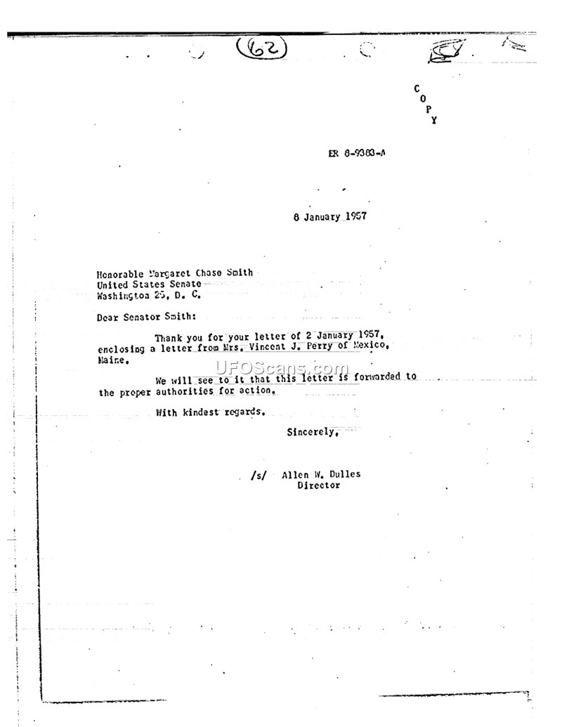 This document is a formal letter dated 8 January 1957, signed by Allen W. Dulles, the Director of the Central Intelligence Agency. The letter is addressed to the Honorable Margaret Chase Smith of the United States Senate. The purpose of the correspondence is to acknowledge receipt of a letter from Senator Smith dated 2 January 1957. Senator Smith's letter had enclosed a communication from a Mrs. Vincent J. Perry, a resident of Mexico, Maine. Director Dulles informs Senator Smith that the agency will ensure the enclosed letter from Mrs. Perry is forwarded to the appropriate authorities for further action.