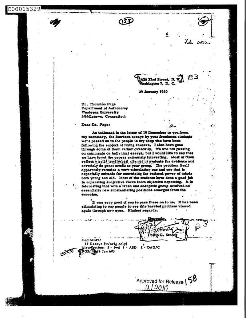 A 1960 letter from Philip G. Strong to Dr. Thornton Page acknowledging receipt of student essays on flying saucers. The author commends the students' objective approach but notes no new findings emerged.