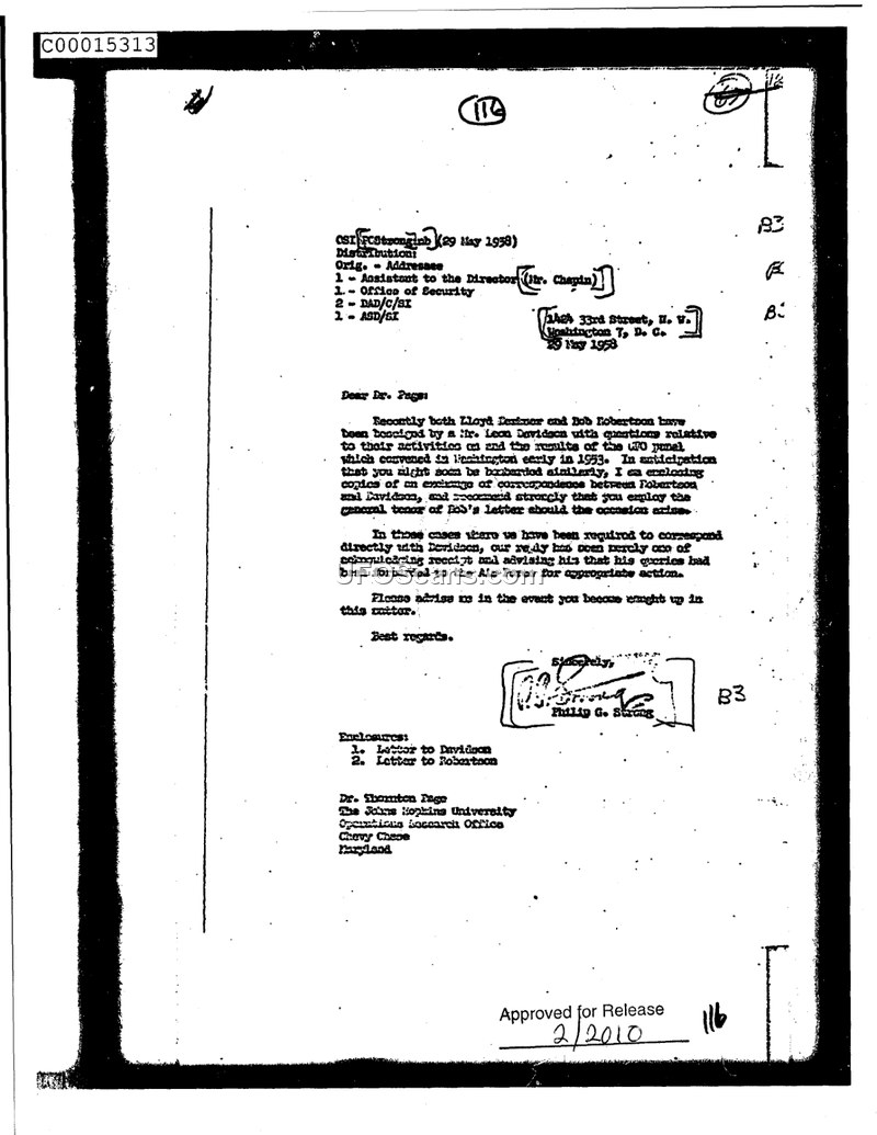 This memorandum, dated May 29, 1958, is addressed to Dr. Thornton Page at The Johns Hopkins University Operations Research Office. The author, Philip G. Strong, writes to inform Dr. Page that two individuals, Lloyd Berkner and Bob Robertson, have been receiving persistent inquiries from a Mr. Leon Davidson. These inquiries concern their activities and the findings of the UFO panel that convened in Washington in 1953. To assist Dr. Page in the event that he is similarly contacted by Mr. Davidson, the author includes copies of previous correspondence exchanged with Davidson. The author explicitly recommends that Dr. Page adopt the general tone used in Bob Robertson's letter when responding to any such inquiries. The document notes that in previous instances, the agency's policy was to acknowledge receipt of the inquiries and advise the sender that their questions had been forwarded to the Air Force for appropriate action.