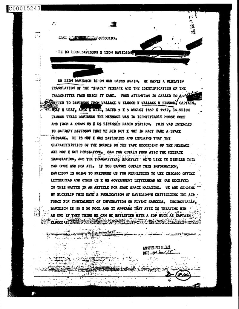 DR LEON DAVIDSON IS ON OUR BACKS AGAIN. HE WANTS A VERBATIM TRANSLATION OF THE "SPACE" MESSAGE AND THE IDENTIFICATION OF THE TRANSMITTER FROM WHICH IT CAME.
