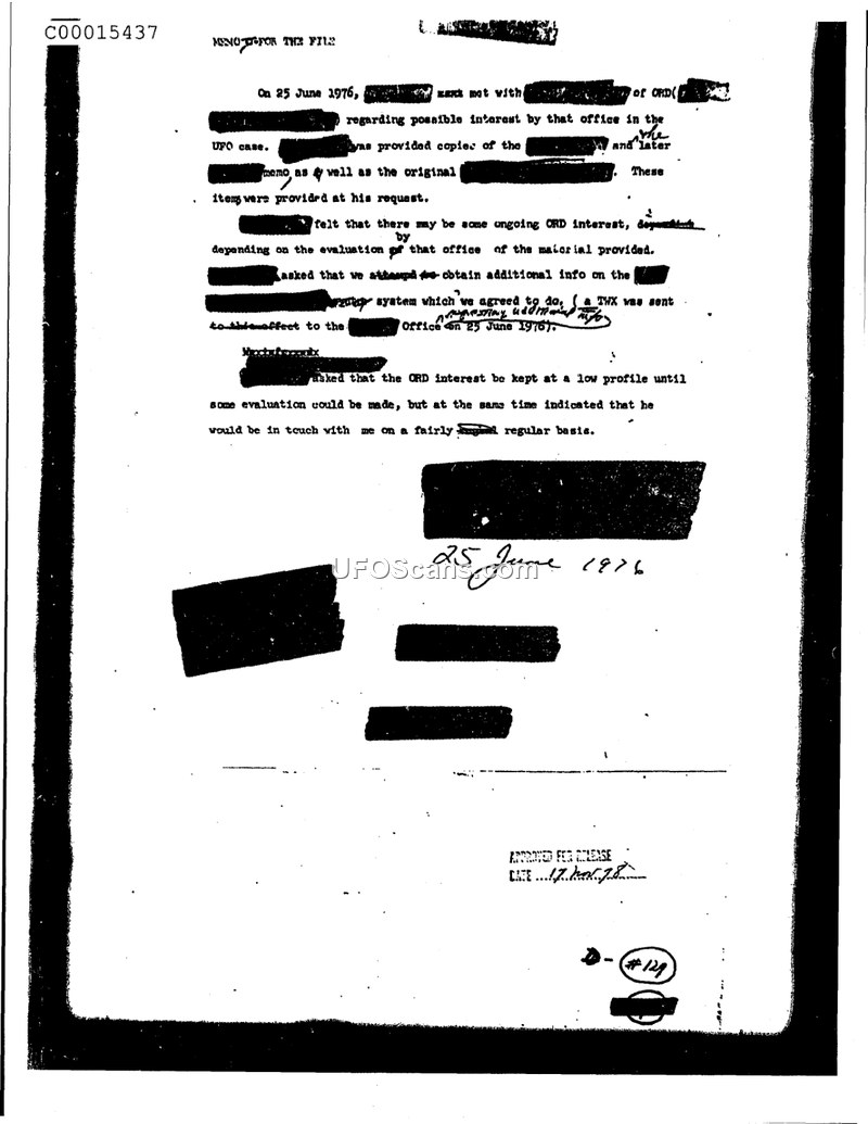 The document records a meeting on 25 June 1976 regarding ORD's interest in a UFO case. The office was provided with copies of materials and requested additional information, which was subsequently requested via a TWX sent on 25 June 1976. The author notes that ORD requested a low profile be maintained regarding their interest.