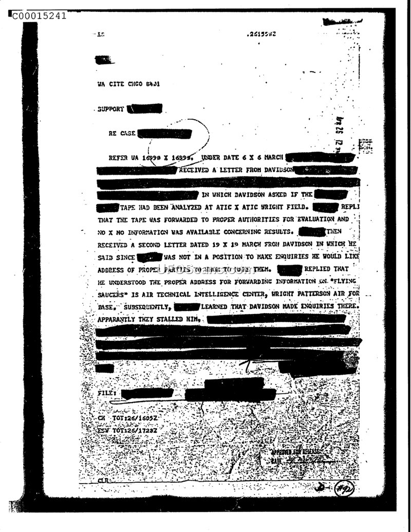 This document is a record of correspondence regarding an individual named Davidson who sought information from the Air Technical Intelligence Center (ATIC). Davidson initially inquired about the status of a tape that had been submitted to ATIC for analysis. He was informed that the tape had been forwarded to the proper authorities for evaluation and that no information regarding the results was available at that time. Subsequently, Davidson sent a second letter requesting the correct address for submitting information concerning 'flying saucers.' In response, he was advised that the appropriate address for such information was the Air Technical Intelligence Center at Wright Patterson Air Force Base. The document notes that Davidson later made inquiries at that location, where he was reportedly stalled.