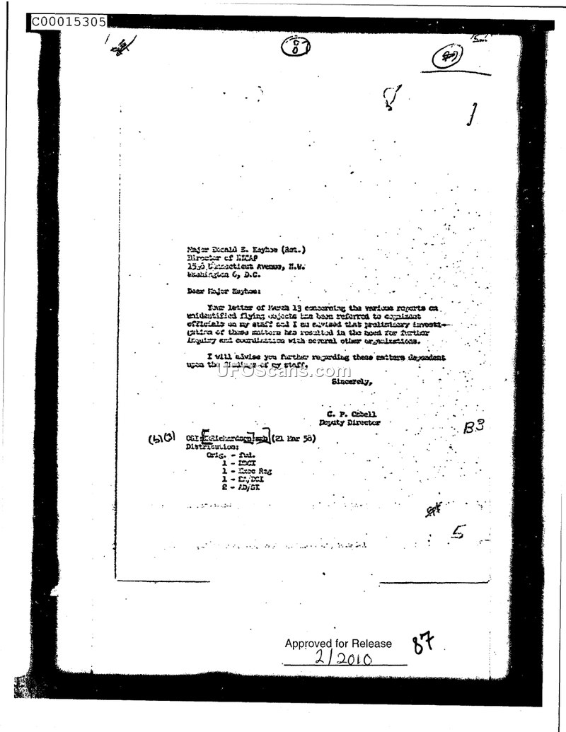 This document is a formal letter dated March 21, 1958, from C. P. Cabell, Deputy Director of the Central Intelligence Agency, to Major Donald E. Keyhoe (Ret.), the Director of NICAP. The letter serves as a response to a previous communication from Major Keyhoe dated March 13, 1958, which concerned various reports on unidentified flying objects. In the letter, Cabell informs Keyhoe that the reports have been referred to the appropriate officials within the agency. He further states that a preliminary investigation into these matters has determined that there is a necessity for additional inquiry and coordination with other organizations. The letter concludes with a promise to provide further information to Keyhoe, contingent upon the findings of the agency's staff. The document includes distribution notations indicating copies were sent to OSI, the Executive Registry, CI/DCI, and AD/SI.