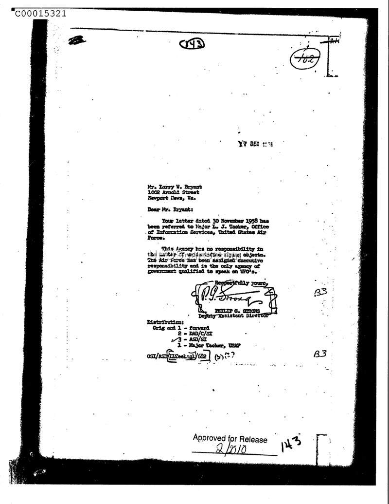 This document is a formal letter dated December 17, 1958, addressed to Mr. Larry W. Bryant of Newport News, Virginia. The letter, signed by P.G. Strong, Deputy Assistant Director, serves as a response to an inquiry Mr. Bryant had previously submitted on November 30, 1958. In the letter, the author informs Mr. Bryant that his inquiry has been referred to Major L. J. Tacker of the Office of Information Services within the United States Air Force. The document explicitly states that the agency producing the letter holds no responsibility regarding the subject of unidentified flying objects. Furthermore, it asserts that the United States Air Force has been assigned executive responsibility for this matter and is the only government agency qualified to address questions concerning UFOs. The document includes a distribution list indicating copies were sent to various internal departments and to Major Tacker.